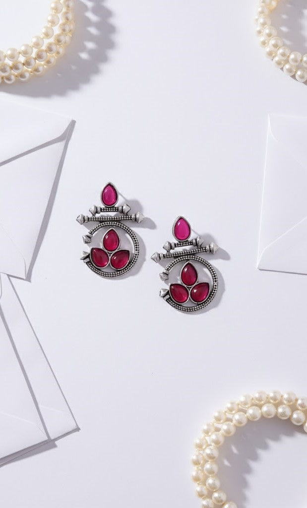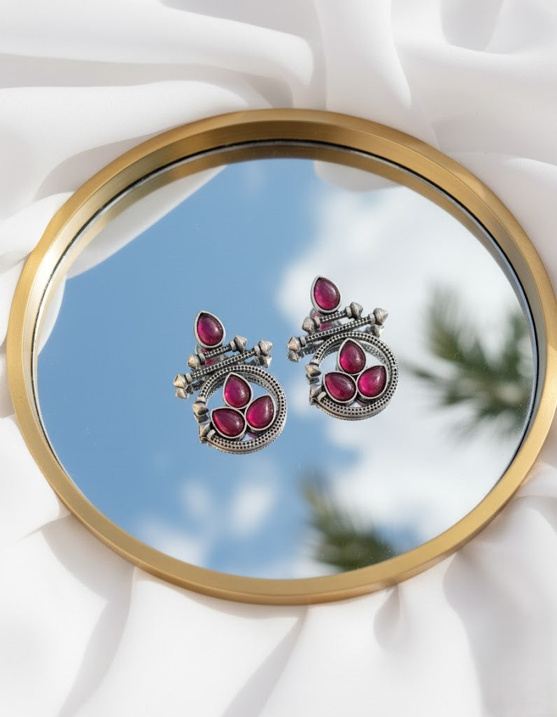 Elegant Oxidized Silver Earrings with Ruby Red Stones
