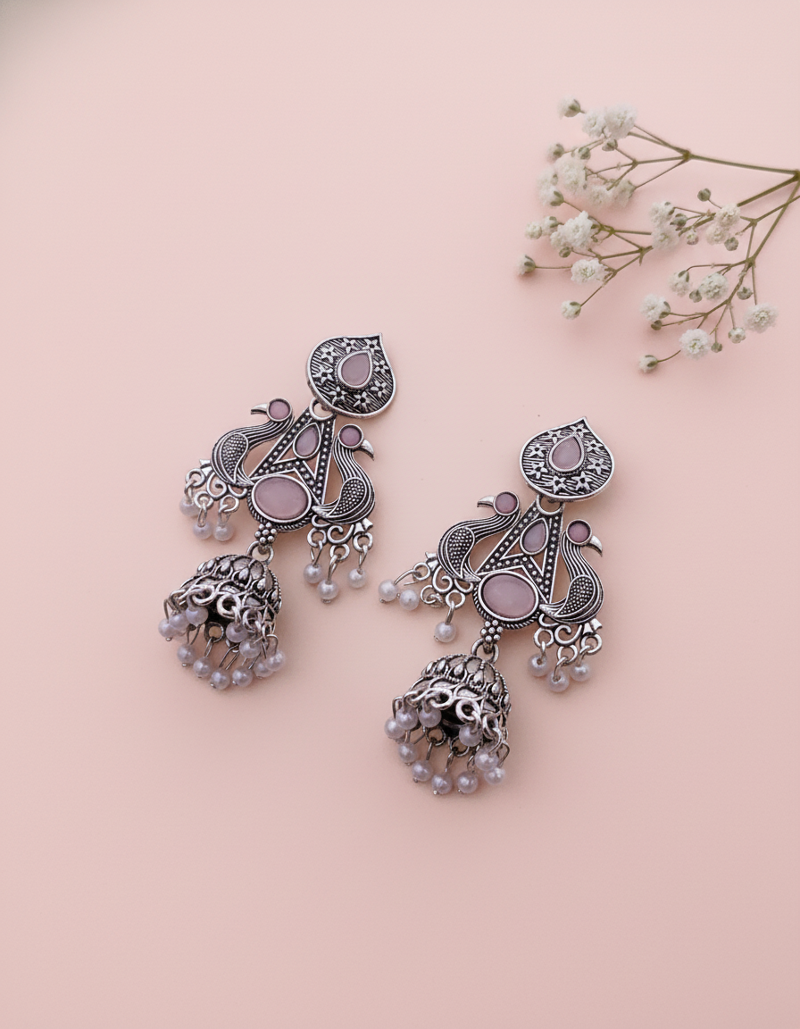 Stunning Oxidized Silver Peacock Jhumka Earrings with Pink Accent Stones